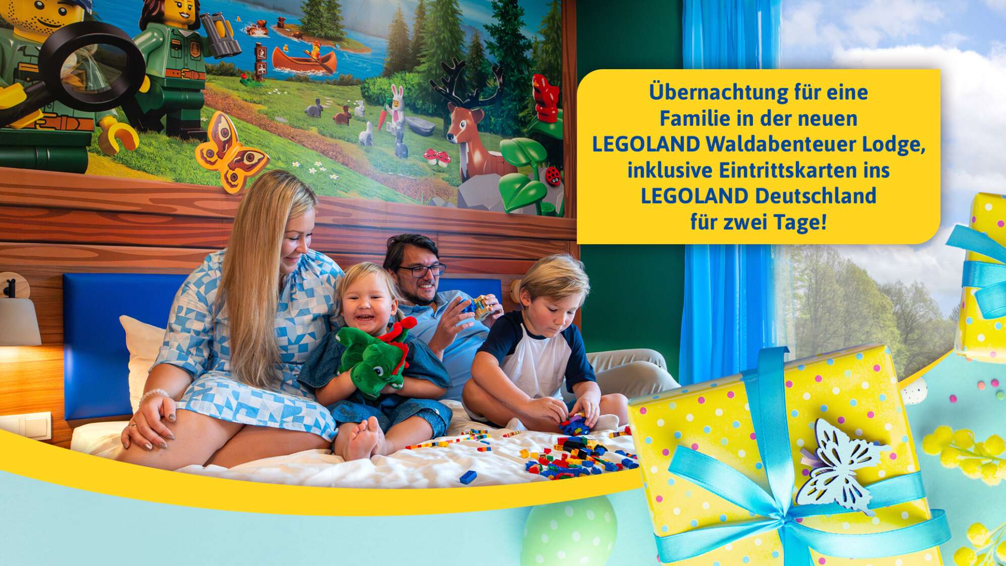 Sichert euch im heutigen ANTENNE BAYERN Osternest eine Übernachtung für euch und eure Familie (2 Erwachsene, 2 Kinder bis 11 Jahre) in der nagelneuen LEGOLAND Waldabenteuer Lodge inklusive Frühstück sowie natürlich Eintrittskarten für vier Personen ins LEGOLAND für zwei Tage.